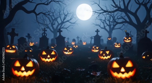 Spooky Halloween Cemetery Scene with Jack O Lanterns and Full Moon graveyard pumpkins