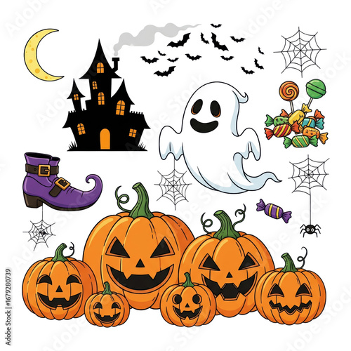 Spooky Halloween Collection: An array of Halloween-themed illustrations, featuring a haunted house, friendly ghost, carved pumpkins, and classic symbols of the season.