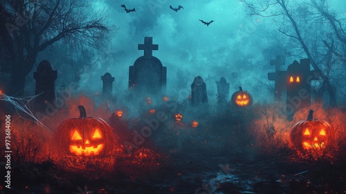Spooky Halloween Graveyard with glowing pumpkins and bats flying in the night sky.