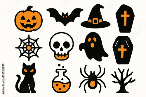 Spooky Halloween Icon Collection – Black and Orange Vector Silhouettes on White Background