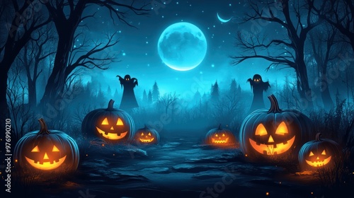background, art, pumpkin, forest, night, tree, wallpaper, graphic, halloween, moon, star, jack, ghost, fire, illustration, tradition, celebration, blue, skittish, digital, october, autumn, scarey, spirit, glowing, holiday, fantasy, fall, haunted, lantern, mysterious, decoration, creepy, mystical, magic, dark, path