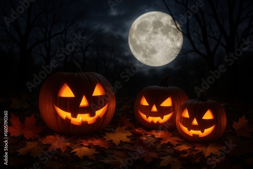 Spooky Halloween jack-o-lantern glowing among autumn leaves with full moon and bare trees silhouette