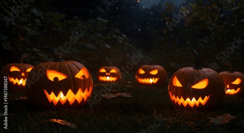 Spooky Halloween Jack-o'-lanterns Glowing in the Dark Night