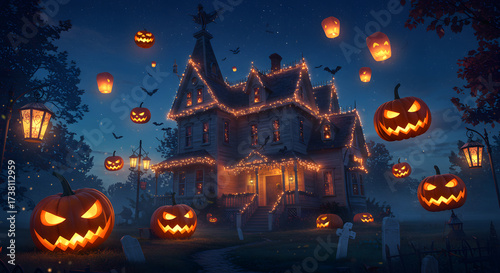 halloween, skittish, night, pumpkin, lantern, bat, cemetery, celebration, holiday, decoration, festive, october, autumn, dark, eerie, illuminated, scarey