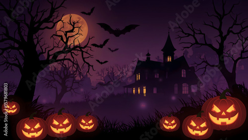 Spooky Halloween Night Scene – Pumpkins, Bats, and Full Moon
