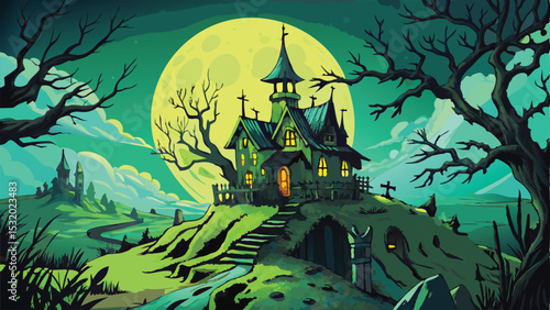 Spooky Halloween night scene with a haunted house in the dark woods, silhouetted by the moon and bats, perfect for an autumn celebration