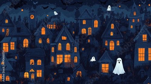 Spooky Halloween night scene with ghostly figures and haunted houses