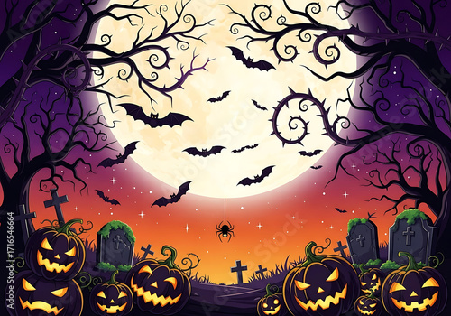 halloween, skittish, night, full moon, pumpkin, cemetery, cemetery, bat, flying, silhouette, tree, branch, eerie, haunted, creepy, dark, orange sky, purple sky, glowing, lantern, scarey, holiday, celebration, autumn, fall, decoration, illustration, art, digital artwork, vector, background, scene, atmosphere, mood, mysterious, supernatural, ghostly, trick or treat, party, invitation, poster, design, jack