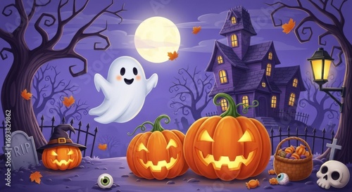 Spooky halloween night with a haunted house, jackolanterns, and a friendly ghost under the full moon