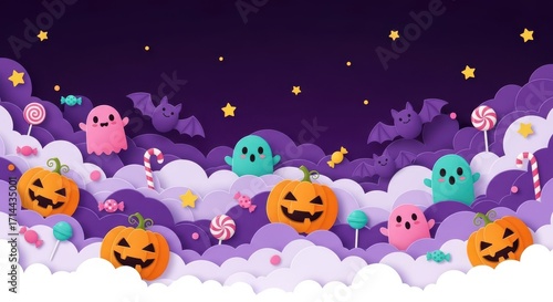 Spooky Halloween Night With Cute Ghosts and Pumpkins