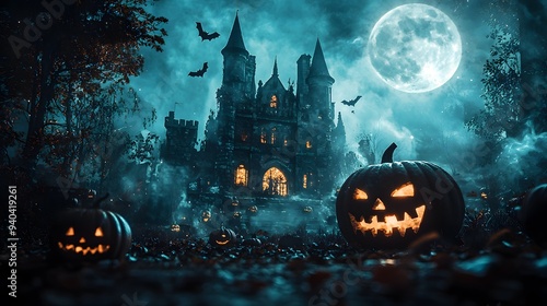 Spooky Halloween night with glowing pumpkins and a haunted castle under a full moon.