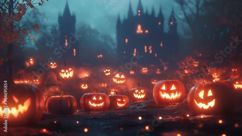 Spooky Halloween Night with Jack O' Lanterns and Haunted Castle in Foggy Forest