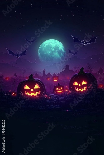 Spooky Halloween Night with Jack-o'-Lanterns and Bats