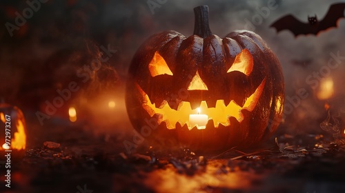skittish, fog, bat, eerie, night, haunted, scarey, festive, horror, autumn, fall, orange, creepy, candlelight, darkness, traditional, seasonal, ghoulish, halloween, pumpkin, lantern, face, october, jack, jack-o-lantern, candle, smile, black, celebration, glowing, decoration, illustration
