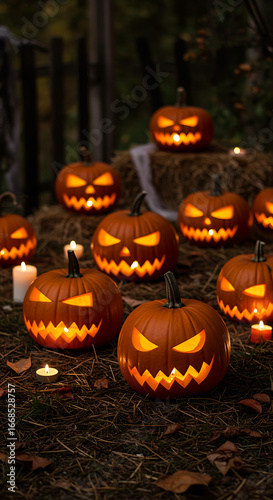 Spooky Halloween pumpkins carved with glowing faces sit on hay bales with candles illuminating the dark night, creating a festive and eerie atmosphere for the holiday