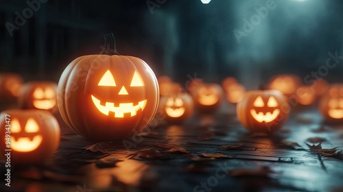 Spooky Halloween pumpkins glow eerily in the night, creating a festive atmosphere filled with autumn magic and seasonal charm.