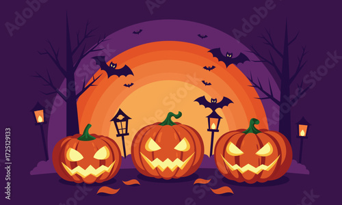 Spooky Halloween pumpkins glowing under a vibrant moon with bats flying in a festive purple sky