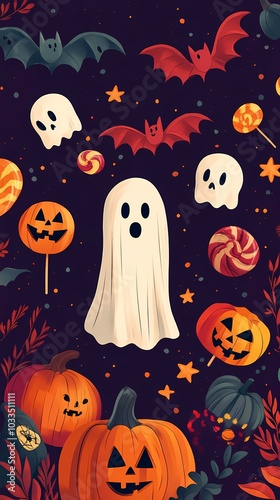 halloween, ghost, bat, candy, pumpkin, skittish, autumn, festive, whimsical, illustration, dark background, fall, celebration, holiday, colourful, art, vibrant, creative, decoration, party, cute, fun, symbol, graphic design, character, seasonal, mood, playful, scarey, imagery, lollipop, charme, trick or treat, horror