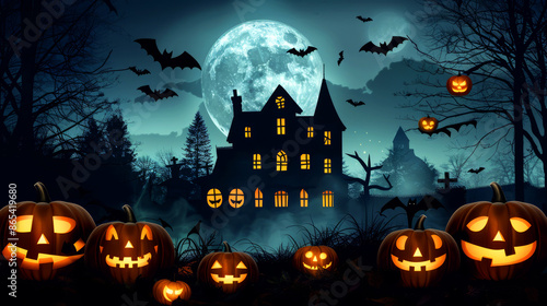 Spooky Halloween scene with a haunted house silhouette, glowing jack-o'-lanterns, and flying bats under a full moon.
