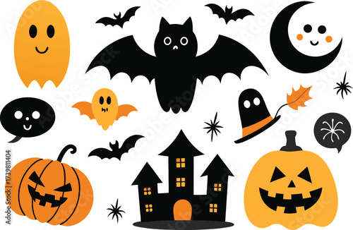 vector, illustration, scalable, icon, halloween, pumpkin, ghost, bat, haunted, house, skittish, cute, cartoon, celebration, holiday, fall, autumn, decoration, design, graphic, clip art, element, set, collection, seasonal, party, invitation, drawing, art, file