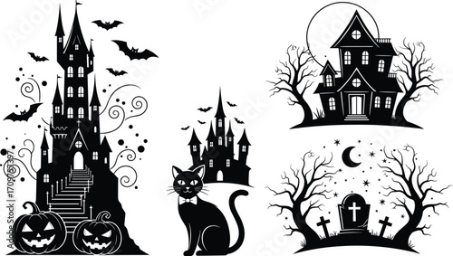 Spooky Halloween vector set with haunted castles, jack-o-lantern pumpkins, black cat, graveyard scene, bare trees, bats, and full moon.
