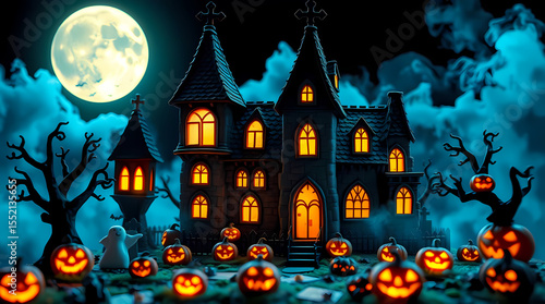 Spooky Haunted Castle with Pumpkins, Ghosts and Full Moon in Halloween Night Cemetery Scene – Generative AI