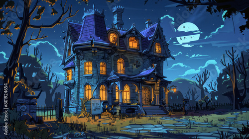 haunted, house, cartoon, skittish, illustration, moonlight, night, tree, mystery, colourful, eerie, glowing, window, sky, high-coloured, style, ghostly, atmosphere, creepy, halloween, luxury home, victorian, gothic, landscape, fantasy, artwork, dark, lighting, blue, scarey, fence, gate, tree branch, cloud, moon, digital, drawing, graphic, horror, architecture, fable, twilight, sinister, decoration