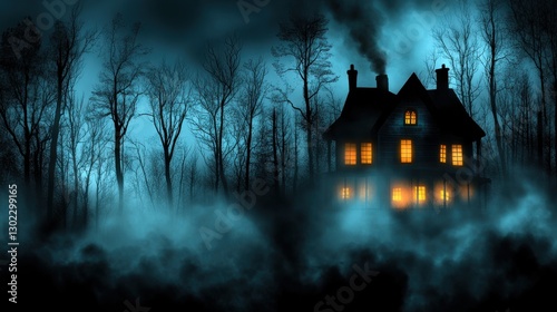 Spooky Haunted House Surrounded by Dark Trees and Mystery Fog