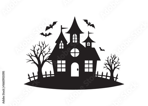skittish, haunted, house, bat, silhouette, vector, halloween, illustration, creepy, scarey, october, autumn, fall, horror, night, dark, ghost, monster, fright, fear, evil, cartoon, cute, isolated, black, white, drawing, decoration