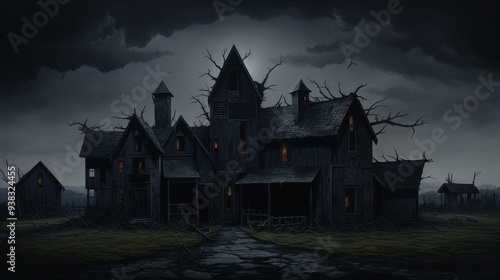Spooky house on Halloween night. Haunted house in night scary forest