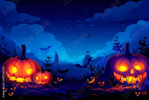 Spooky jack-o-lantern. Eerie forest ambient. Blurred background. October season. Autumn festival. Party card