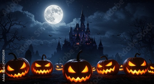 Spooky Night with Haunted Castle and Jack-o'-Lanterns Under Full Moonlight