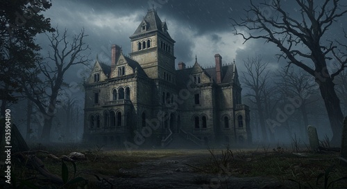 Spooky old mansion house in a dark rainy forest setting fog mood grey trees scary night storm ruins