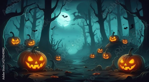 Spooky Pixel Art Jack O Lanterns in Dark Forest under Full Moon at Halloween Night