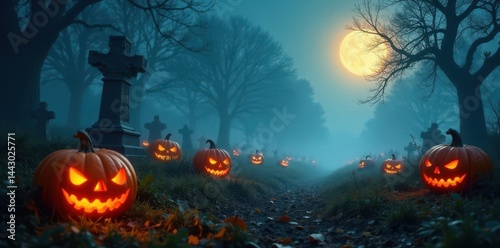 Spooky pumpkin patch amidst eerie graveyard fog, eerie, haunted