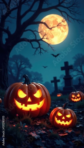Spooky pumpkins and gravestones lit up at night with a full moon behind them, dark, nighttime