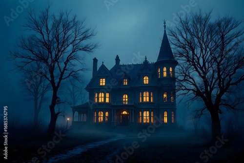 haunted, house, luxury home, victorian, architecture, old, building, glowing, window, night, dark, fog, mist, eerie, atmosphere, skittish, creepy, horror, gothic