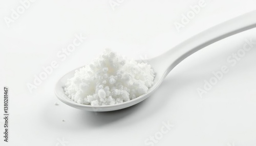Spoonful of white sugar against a pure white backdrop, white background, sweetness