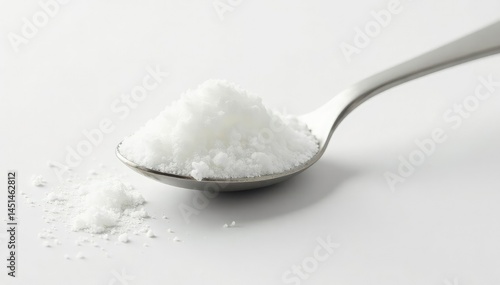 Spoonful of white sugar against stark white backdrop, clean, macro, texture