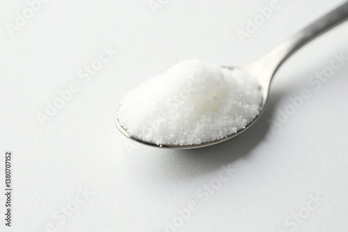 Spoonful of white sugar against white backdrop, clean, sugar, closeup