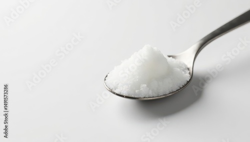 Spoonful of white sugar against white backdrop, close-up, background, table sugar