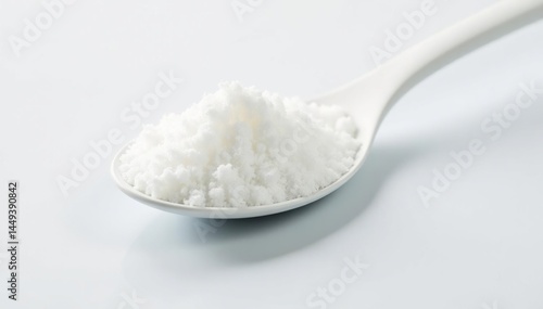 Spoonful of white sugar against white backdrop, confectionery, isolated