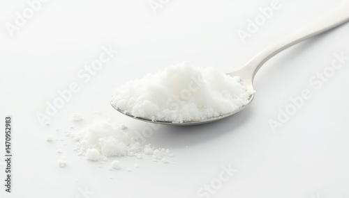 Spoonful of white sugar against white backdrop, cooking, sweetener