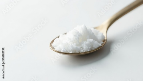 Spoonful of white sugar against white backdrop, kitchen, minimal