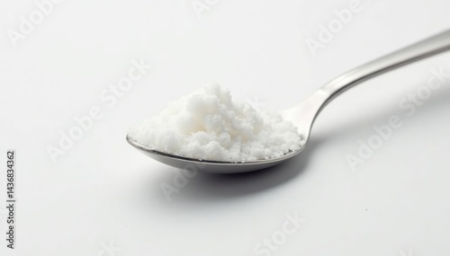 Spoonful of white sugar against white backdrop, kitchen, sugar, closeup