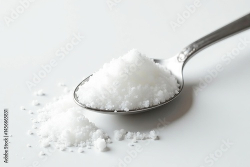 Spoonful of white sugar against white backdrop, powder, candy, dessert