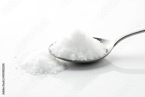 Spoonful of white sugar against white backdrop, spoonful, cane sugar