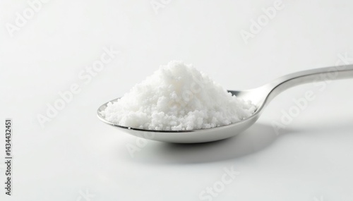 Spoonful of white sugar against white backdrop, sprinkles, object, granule