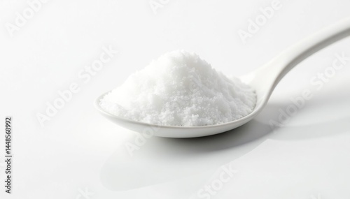 Spoonful of white sugar against white backdrop, sugar, granular, closeup