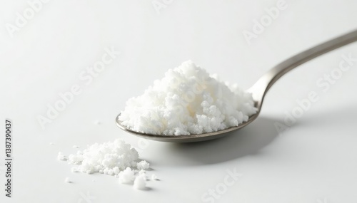 Spoonful of white sugar against white backdrop, sweet, clean